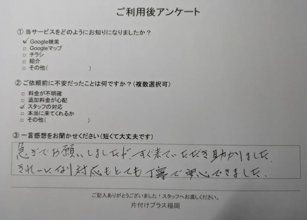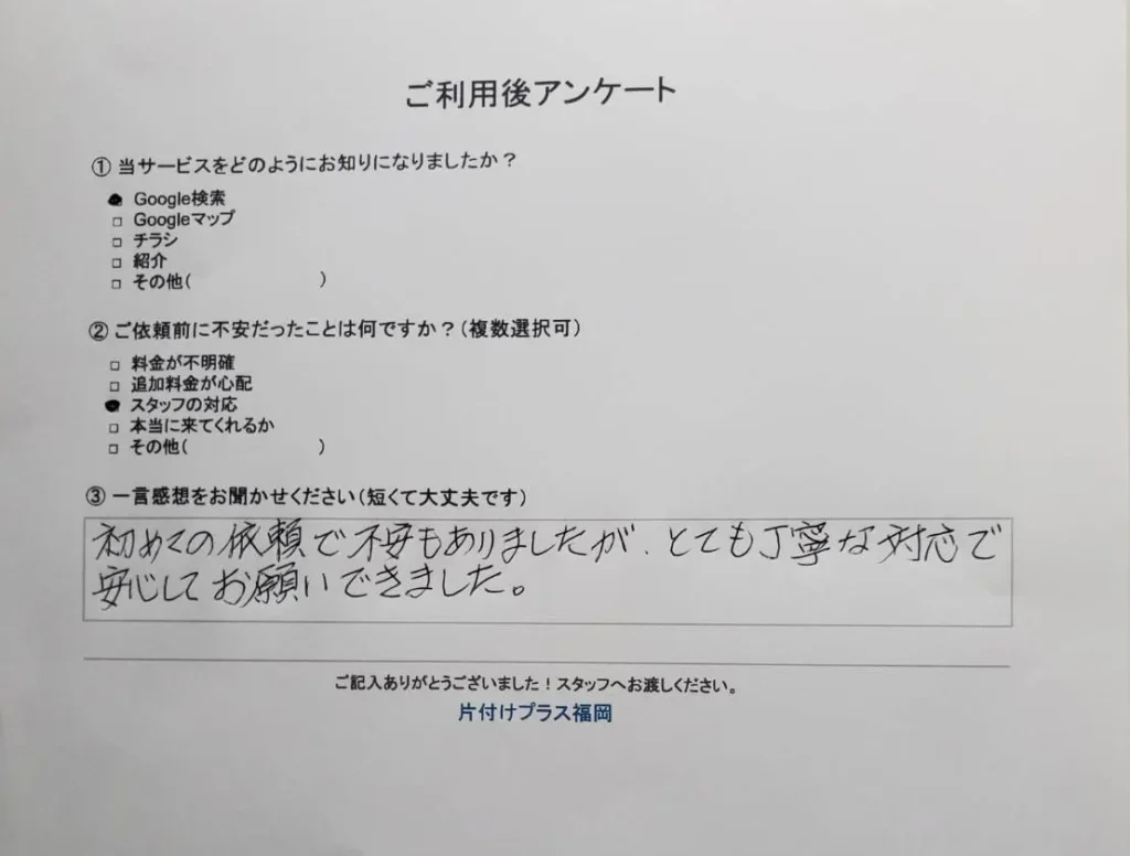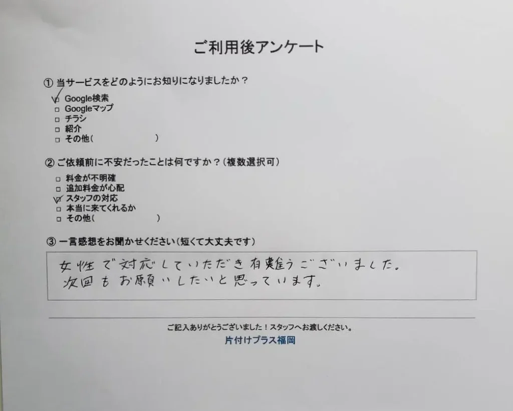お1人暮らしという事で、女性スタッフで対応させていただきました。作業や費用についてもご満足いただけました。またのご利用をお待ちしております。