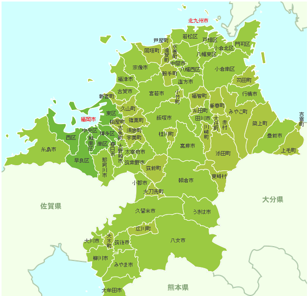 ■ 福岡市・ 北九州市・筑紫野市・春日市・大野城市・太宰府市・那珂川市・糸島市・粕屋郡(粕屋町・志免町・新宮町・久山町・篠栗町・須恵町・宇美町) 宗像市・古賀市・福津市・筑豊(田川市・行橋市・飯塚市・直方市・田川郡)・筑後(久留米市・大川市・柳川市・八女市・小郡市)など