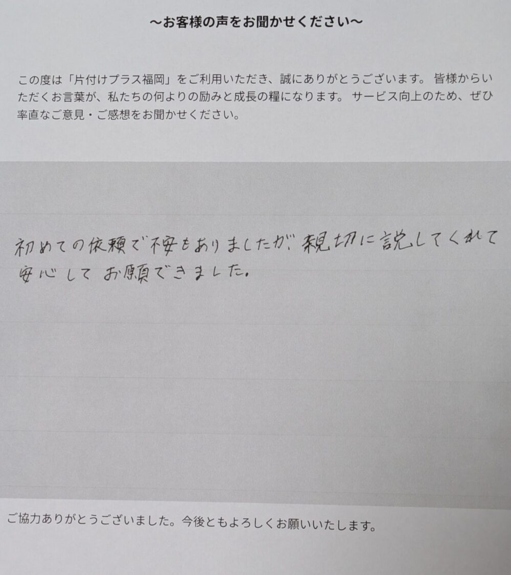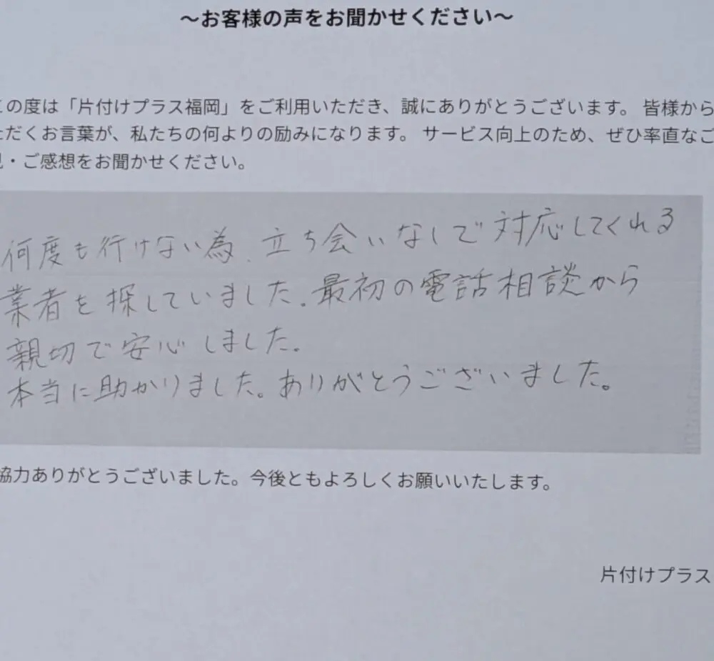 何度も行けないため、立ち会いなしで対応してくれる業者を探していました。最初の電話相談から親切で安心しました。本当に助かりました。ありがとうございました。