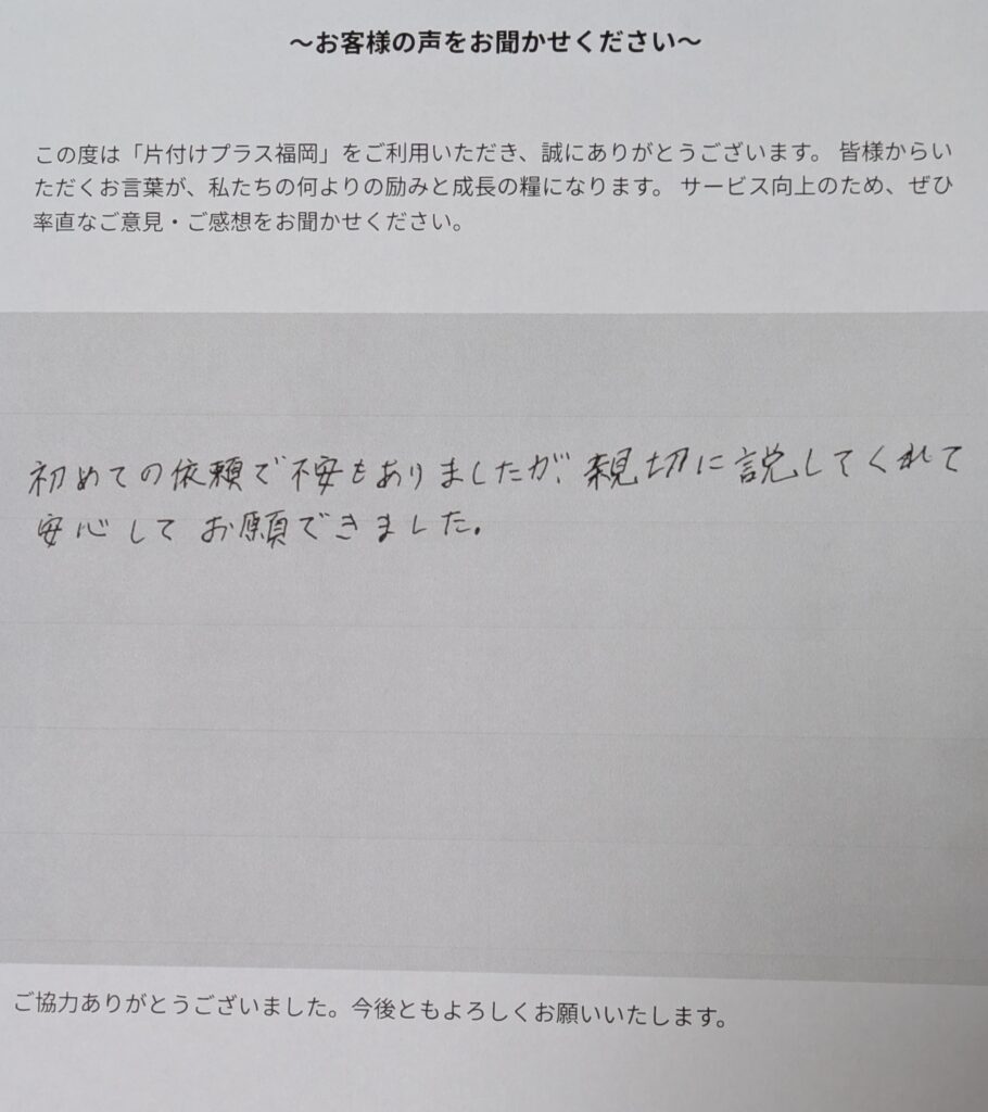 お急ぎの片付けとのことで、迅速に対応させていただきました。丁寧な作業や費用面についてもご満足いただけたようで何よりです。またのご利用をお待ちしております。